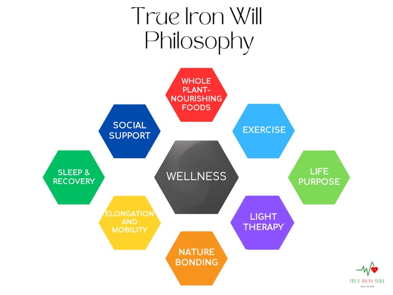 At True Iron Will, we simplify healthspan using the WELLNESS framework: